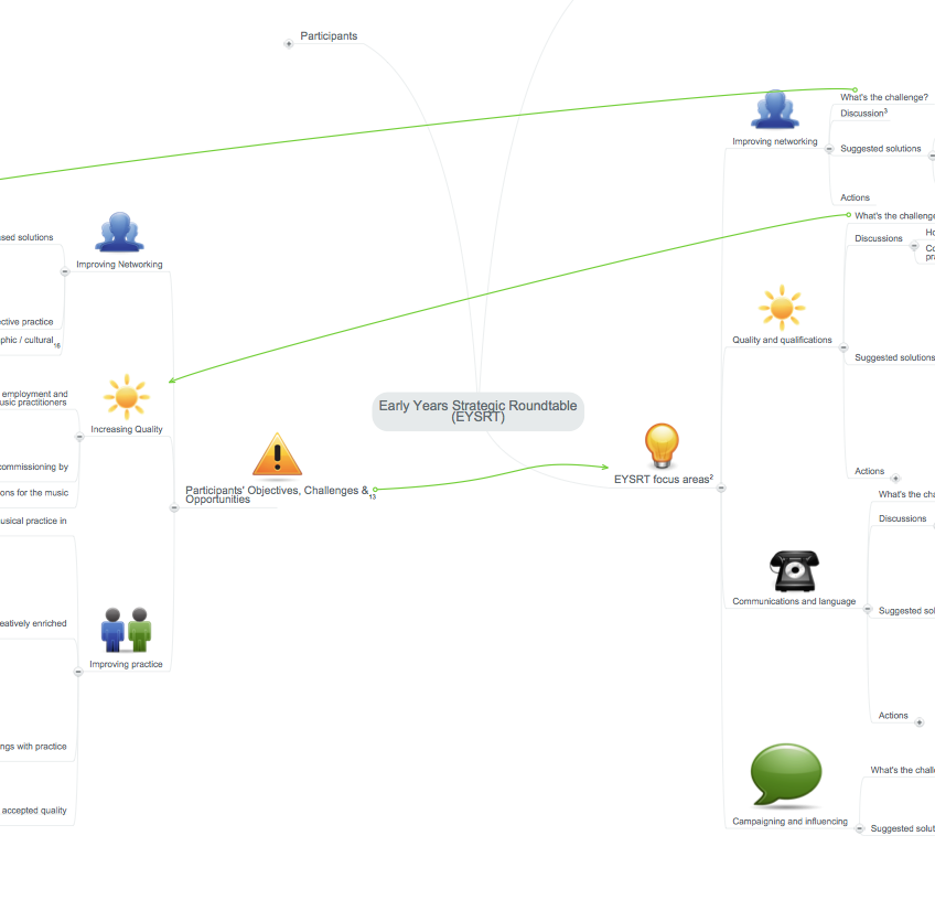 You can read about some of our findings. Firstly, in September 2012 we worked on a map of the issues and challenges for arts in the Early Years, as well as some of the solutions. This is written up both as a mind-map and as a Word document.