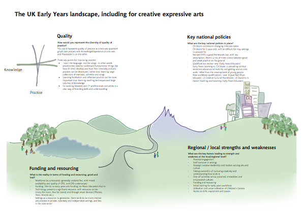 Secondly, in January 2013 we worked collectively on a broad-view map of the Early Years and Arts landscape, available as a poster.